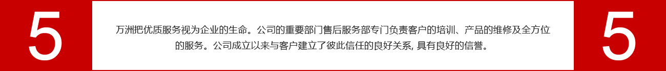 萬(wàn)洲一直繼承和發(fā)揚(yáng)了誠(chéng)信為本,以質(zhì)取勝的經(jīng)營(yíng)理念,為顧客提供完善的售前、售中和售后服務(wù),贏(yíng)得了廣泛的市場(chǎng)美譽(yù)和良好的口碑,也因此在