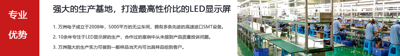 深圳市萬(wàn)洲電子有限公司是一家專(zhuān)業(yè)致力于LED顯示屏,LED顯示屏模組,單元板及LED照明,LED燈飾應(yīng)用產(chǎn)品為主營(yíng)業(yè)務(wù),集研發(fā)、生產(chǎn)、銷(xiāo)售及工程設(shè)計(jì),工程服務(wù)為一體的高新技術(shù)企業(yè)。公司憑借一批在行業(yè)內(nèi)的資深人才和技術(shù)精英的獨(dú)特優(yōu)勢(shì),并結(jié)合先進(jìn)的管理理念以及對(duì)產(chǎn)品,對(duì)客戶(hù)負(fù)責(zé)認(rèn)的嚴(yán)謹(jǐn)態(tài)度,已成為國(guó)內(nèi)外知名的LED顯示屏及照明領(lǐng)域的生產(chǎn)商和服務(wù)商。目前公司業(yè)務(wù)已遍布中國(guó)所有省份的400余個(gè)城市和海外四十多個(gè)國(guó)家或地區(qū),并于所有客戶(hù)都建立了良好的合作關(guān)系,完美的品質(zhì)得到客戶(hù)的認(rèn)同,萬(wàn)洲品牌越來(lái)越多受到業(yè)內(nèi)廣泛關(guān)注。